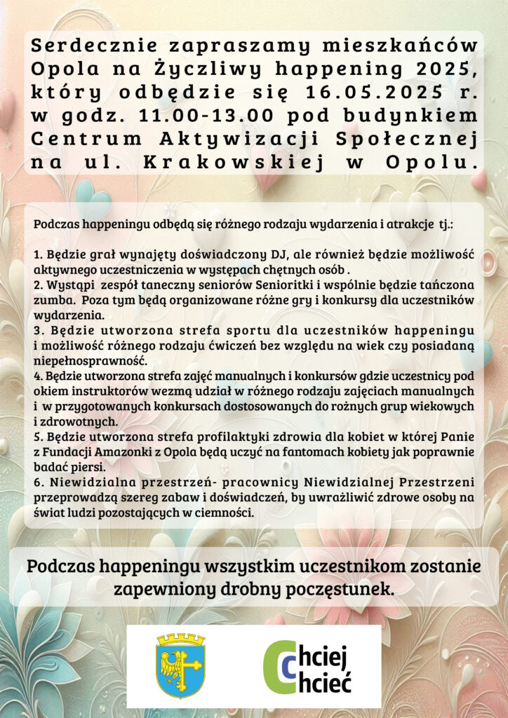 W ramach projektu zaplanowano 16.05.2025 r. wiosenny happening, który odbędzie się na terenie miasta Opola w ścisłym centrum miasta pod budynkiem Centrum Aktywizacji Społecznej na ul. Krakowskiej 32. Działanie związane jest z kolejną edycją kampanii Opole w Rytmie Życzliwości, której celem głównym jest promowanie życzliwości. Podczas happeningu odbędą się różnego rodzaju wydarzenia i atrakcje dla mieszkańców Opola w tym: osób niepełnosprawnych, starszych oraz młodzieży i dzieci.